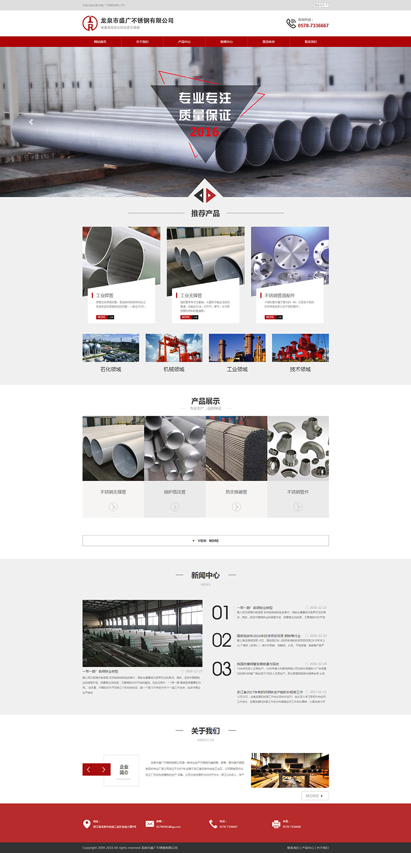 龍泉市盛廣不銹鋼有限公司是一家專業(yè)生產(chǎn)不銹鋼無縫鋼管,焊管,管件等不銹鋼制品的專業(yè)廠家公司成立于2007年.坐落于浙江省龍泉市金崗工業(yè)區(qū),公司擁有現(xiàn)代化的工廠區(qū)和先進(jìn)精良的生產(chǎn) 設(shè)備。公司占地總面積30000平方米,職工100余人,年產(chǎn)和銷售不銹鋼管,管件等產(chǎn)品5000噸。