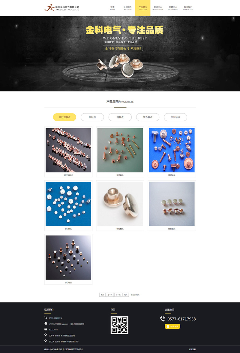 徐州金科電氣有限公司坐落于歷史名城漢高祖劉邦誕育之地江蘇徐州市,是一家集生產(chǎn)研發(fā)銷售為一體的企業(yè),公司擁有先進(jìn)的生產(chǎn)和檢測設(shè)備為產(chǎn)品的質(zhì)量和新品的研發(fā)提供了強(qiáng)有力的支持與保。,公司在制造貴/廉金屬電觸頭材料.銀觸點(diǎn).高低壓開關(guān)相關(guān)組件.復(fù)合帶材等方面擁有完善的技術(shù)。其產(chǎn)品廣泛運(yùn)用于高低壓電器.家用電器.汽車電器電子產(chǎn)品等,擔(dān)負(fù)著電流的接通與分?jǐn)嗳蝿?wù),是電器工業(yè)的核心元件,其性能直接關(guān)系到整體設(shè)備的使用壽命和安全可靠性。