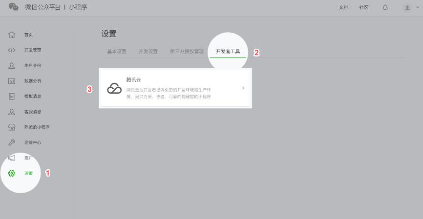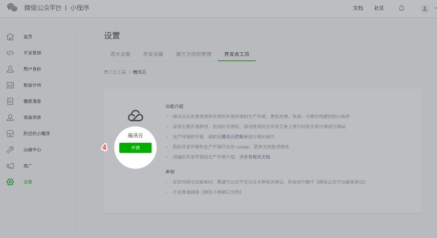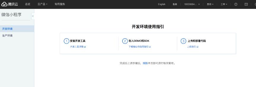 使用小程序綁定的微信掃碼即可將小程序授權(quán)給騰訊云,開通之后會自動進去騰訊云微信小程序控制臺,顯示開發(fā)環(huán)境已開通,此時可以進行后續(xù)操作。