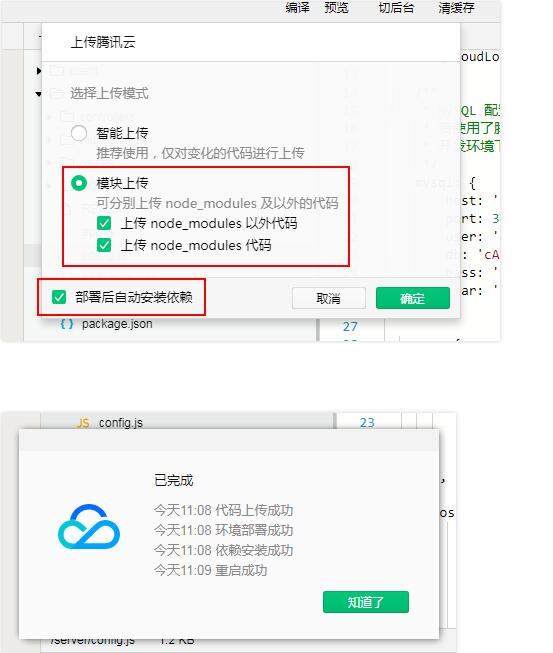 選擇【模塊上傳】并勾選全部選項,然后勾選【部署后自動安裝依賴】,點擊【確定】開始上傳代碼。