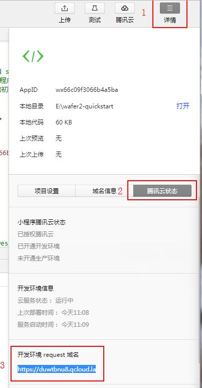 上傳代碼完成之后,點擊右上角的【詳情】按鈕,接著選擇【騰訊云狀態(tài)】即可看到騰訊云自動分配給你的開發(fā)環(huán)境域名: