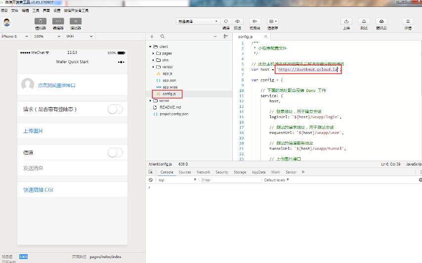 完整復(fù)制(包括 https://)開發(fā)環(huán)境 request 域名,然后在編輯器中打開 client/config.js 文件,將復(fù)制的域名填入 host 中并保存,保存之后編輯器會自動編譯小程序,左邊的模擬器窗口即可實時顯示出客戶端的 Demo: