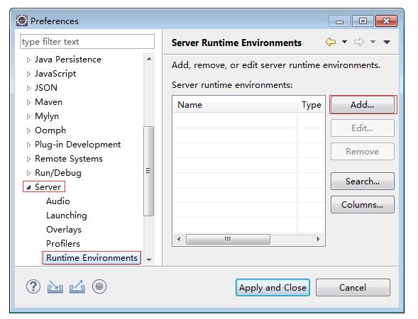 (3) 在 Preferences 對話框,依次單擊 Server→Runtime Enviroments→Add,如圖 所示。